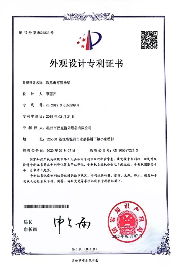 डायनासोर के आकार के पर्कशन का आकार 120 * 55 * 140 सेमी है, जिसमें मिश्र धातु एल्यूमीनियम + ग्लास फाइबर प्रबलित प्लास्टिक + गैल्वेनाइज्ड पाइप से बना है। इसका समग्र रंग हरा है, इसके शरीर के मध्य में विभिन्न रंगों की आठ एल्यूमीनियम ट्यूब हैं। उसके पैरों के नीचे उसके शरीर को सहारा देने वाले दो पीले इलेक्ट्रॉन हैं। सिर और गर्दन पर कई पीले रंग की सजावट हैं जो डायनासोर की विशेषताओं को उजागर करती हैं।