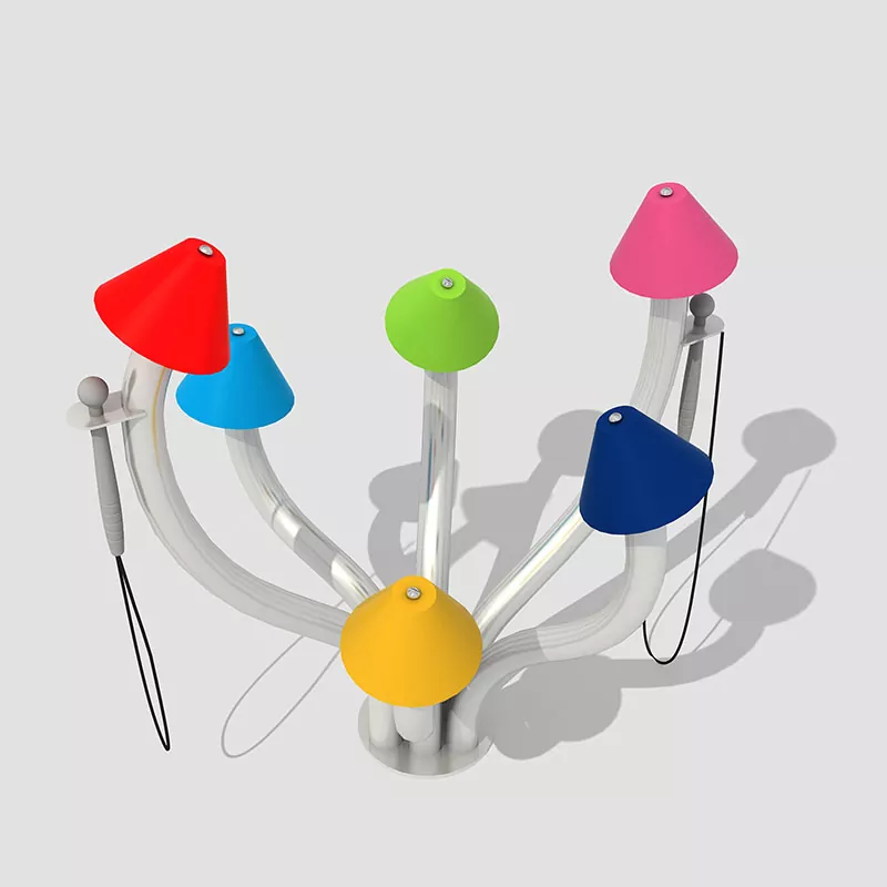 जीवंत रंगों के साथ छह पाउडर लेपित शंक्वाकार "टोपियों" का एक सेट, जिसमें विभिन्न ऊंचाइयों और कोणों पर नालीदार स्टेनलेस स्टील की छड़ें हैं, जो इसे एक आकर्षक तत्व बनाती है जो जल्द ही सबसे लोकप्रिय बन जाएगी।