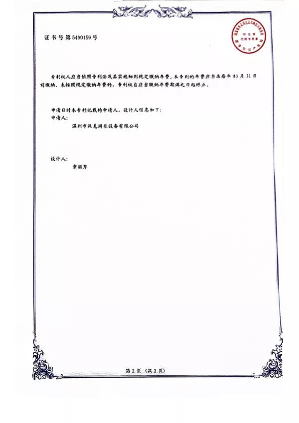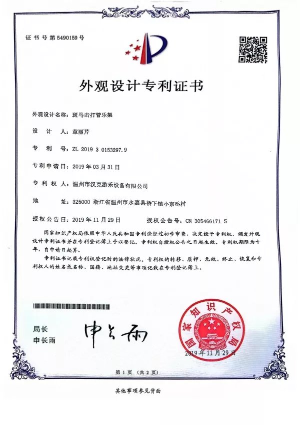 उसी समय, हैंक के स्वामित्व वाले उत्पाद के रूप में, हमने 2019 में ज़ेबरा शेप्ड पर्कशन इंस्ट्रूमेंट स्टैंड के लिए डिज़ाइन पेटेंट प्रमाणपत्र के लिए आवेदन किया और चीनी बौद्धिक संपदा कार्यालय से अनुमोदन प्राप्त किया।
